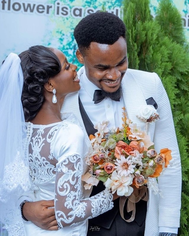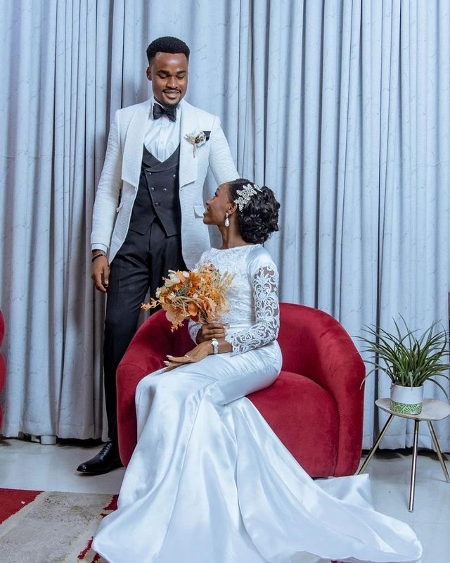 This gown features a graceful satin finish combined with a beautifully embroidered lace back and sleeves, giving it a refined, royal silhouette. The fitted bodice and flowing train enhance the bride’s natural elegance, while the detailed lace artwork adds depth, style, and uniqueness to the design.